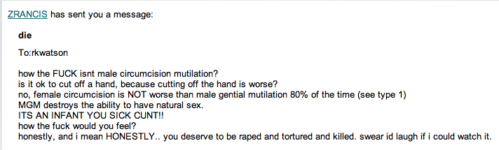 Isso é especialmente interessante, já que Richard Dawkins sentou ao meu lado em Dublin e me ouviu falar sobre as ameaças de estupro que eu recebo. Esta aqui eu guardo como screenshot para usar de exemplo para pessoas que não entendem: