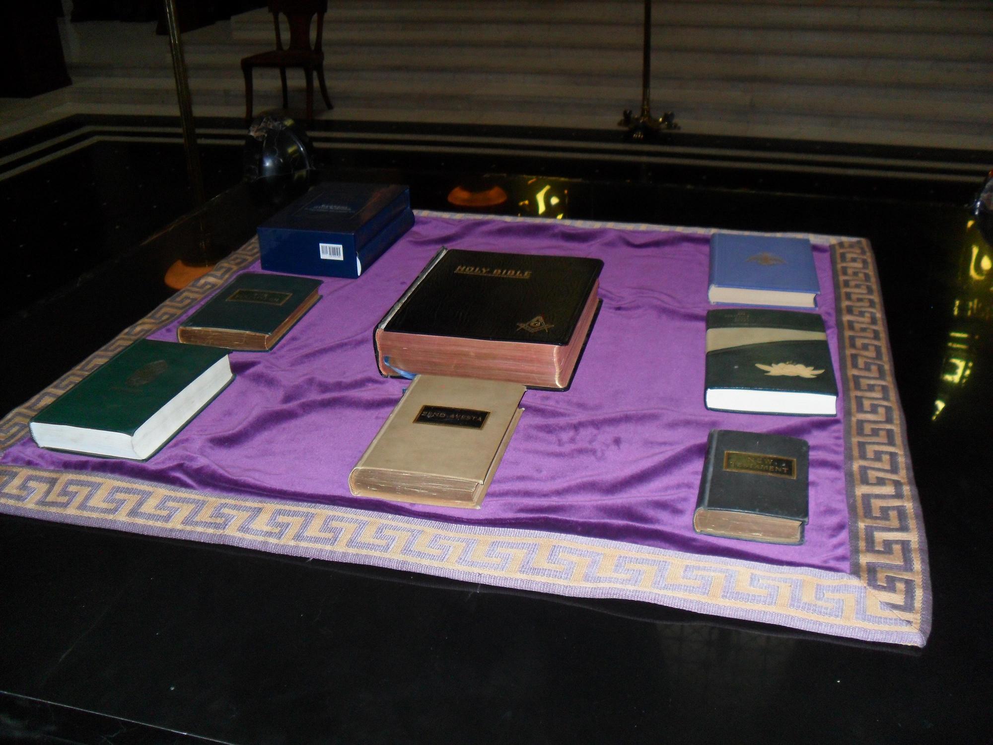 E como o coração e a mente da Sublime Ordem Maçônica estão no Altar Maçônico, onde todo maçom presta seus juramentos perante seu Livro Sagrado, o Esquadro e o Compasso, foi para o Templo que dirigi a melhor de minhas atenções. Em seu centro está o gigantesco Altar, feito de mármore preto, e pode-se ler no chão à sua volta: “Da luz do Verbo Divino, o Logos, vem a sabedoria da vida e o objetivo da Iniciação“. Logo acima, no teto, um vitral permite a luz do Sol iluminá-lo. Mas é sobre o Altar que se vê a Universalidade da Maçonaria: estão presentes 8 Livros Sagrados.